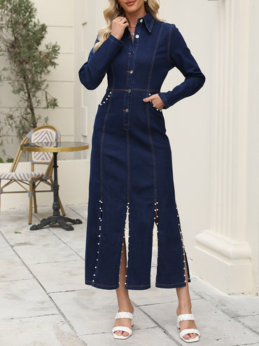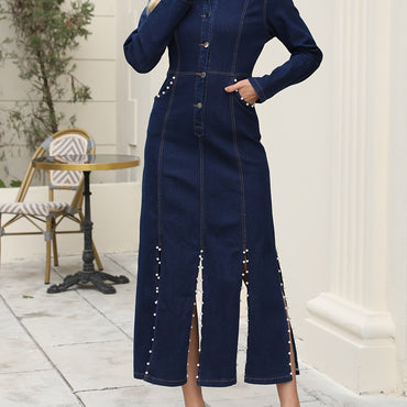 Elegant Dark Blue Denim Midi Dress with Beaded Hem - Women's Long Sleeve, Button-Up Jean Dress, Stretch Rayon/Polyester Blend, Machine Washable for Fall/Winter, Denim Dress