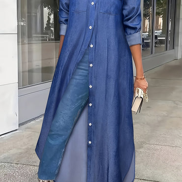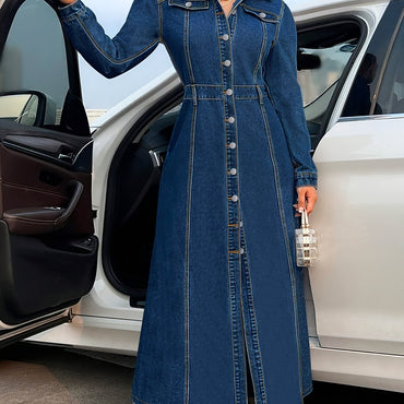 Elegant Long Sleeve Denim Midi Dress for Women - Chic Single-Breasted Button Design with Side Slit, Stretchy Rayon/Polyester Blend, Machine Washable - Perfect for Fall/Winter