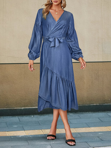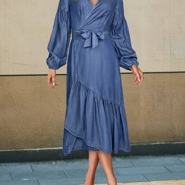 Women's Casual Denim Dress with Elastic Waistband and Pleated Skirt - Long Sleeve, Lightweight Lyocell Fabric, Solid Washed Blue