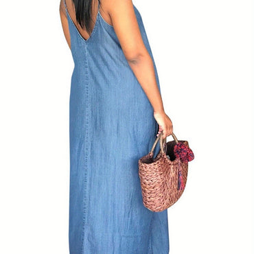 Womens Summer Spaghetti Strap Dresses Casual Denim Deep V Neck Loose Maxi Dress