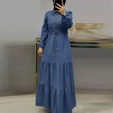 Ramadan Long Sleeve Shirt Collar Modest Dress, Drawstring Waist Solid Abaya, Women's Clothing