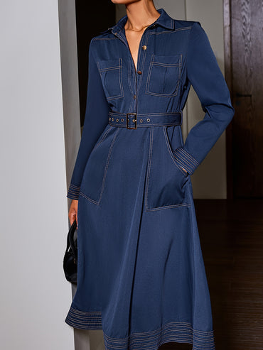 Women's Dress with Turned-up Collar, Long Sleeves, Pockets, Commuting and Daily Shirt
