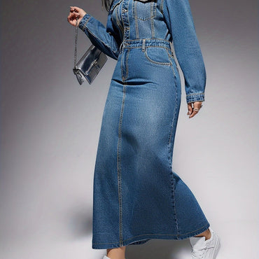[Chic Denim Midi Dress] Stretchy Chic Denim Midi Dress for Women - Elegant Long Sleeve Single-Breasted Design with Flap Pockets, Rayon & Polyester Blend, Machine Washable - Perfect for Fall/Winter