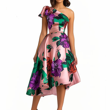 Mother Of The Bride And Groom Dress, Wedding Guest Dress, Party Dress, Semi Formal Dress, Pink Floral Dress, One-shoulder Dress, Satin Dress, Midi Dress with Asymmetrical Hem, Elegant Style, Summer Dress, Women's Fashion