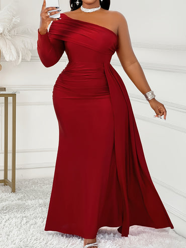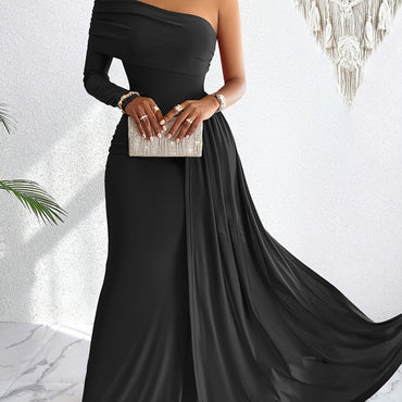 Elegant One-Shoulder Long Sleeve Bodycon Dress, Polyester Knit Fabric with Elastane, Solid Color, Strapless Design, for Women, Fall Season Evening Gown