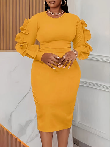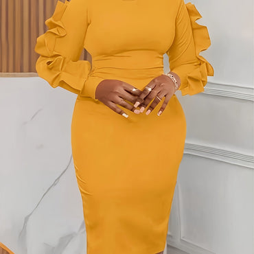 Elegant Style, Plus Size Elegant Yellow Knit Dress with Ruffle Detail - Long Sleeve, Round Neck, Stretch Fabric, Non-Sheer - Ideal for Spring/Summer, Cute Dresses