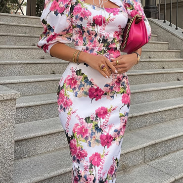 [Machine Washable Patchwork Party Dress] Elegant Mid-Length Pleated Dress with Flower Patchwork, Bare Shoulder Design for Parties - Polyester and Elastane, Machine Washable