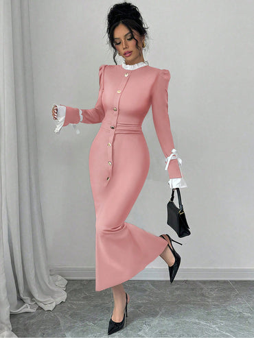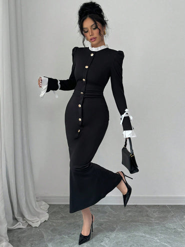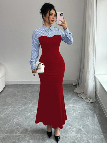 Raffinéa Women's Elegant Color Blocking Slim Dress, Autumn/Winter Maxi Women Outfit