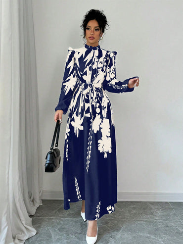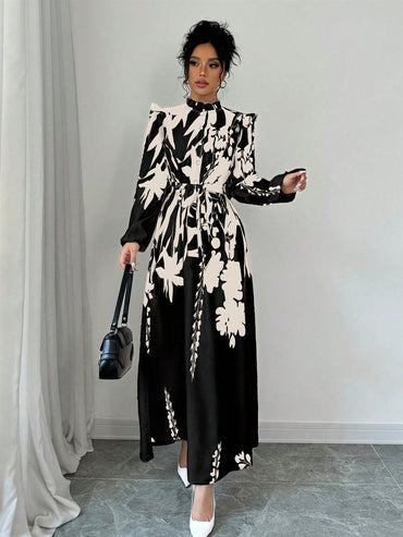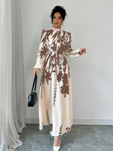 Elenzga Women's Elegant Plant Print Cinched Waist Long Dress For Autumn Maxi Women Outfit