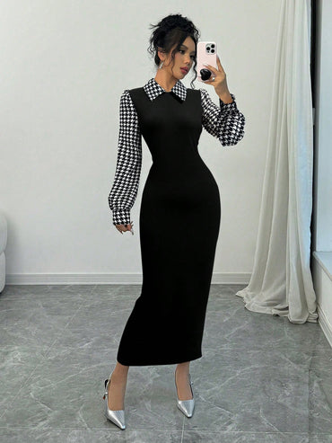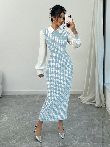 Raffinéa Fashionable Elegant Slim Long Patchwork Puff Sleeve Collar Houndstooth Pattern Fabric Women's Long Dress, Autumn/Winter Maxi Women Outfit