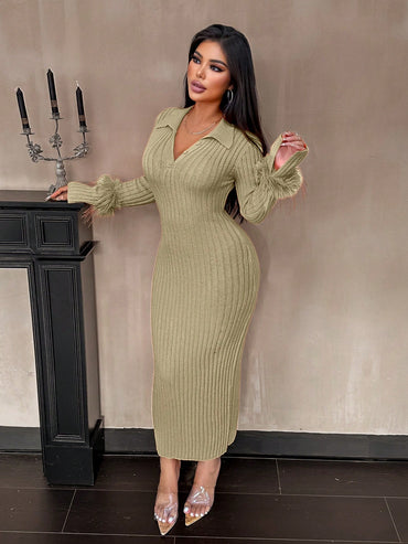 Raffinéa Elegant Bodycon AB Paneled High Slit Long Sleeve Open Cuff Fish Hem Stripe Mixed Knit Dress For Women, Autumn/Winter Maxi Women Outfit