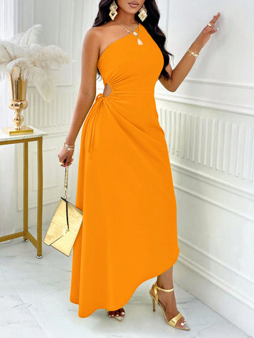 SOLERSUN One Shoulder Cut Out Drawstring Side Asymmetrical Hem Dress Dress Maxi Women Outfit