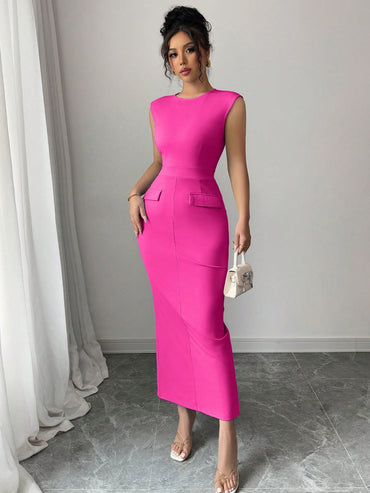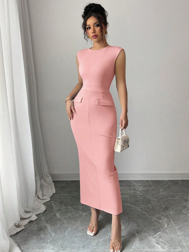 SOLERSUN Summer Elegant Solid Color Pleated Slim-Fit Sleeveless Dress Maxi Women Outfit