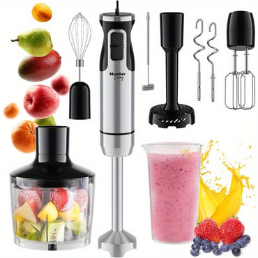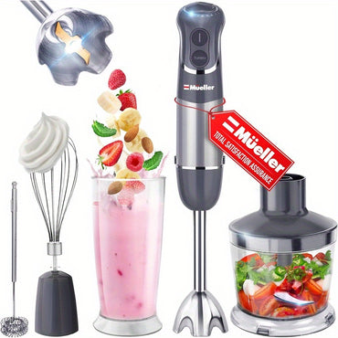Mueller 5-in-1 Immersion Blender Handheld with Milk Frother, Whisk, Beaker & Chopper Attachments - 12-Speed & Turbo Boost, 800W Copper Motor & Titanium Blades, Cordless Operation, 304 Stainless Steel, Dishwasher-Safe - Grey All-in-One Kitchen Appliance, F