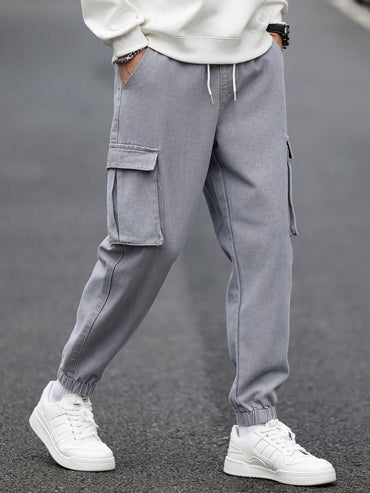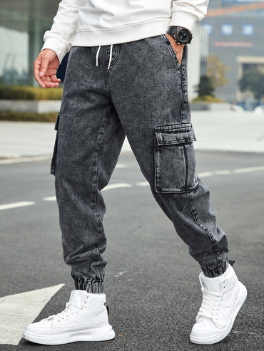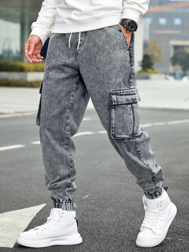 Manfinity Homme Men's Drawstring Waist Cargo Denim Pants With Slanted Pockets