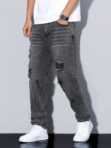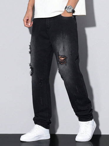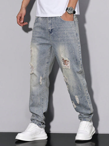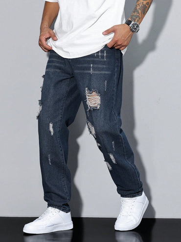 Manfinity Homme Men's Casual Loose Straight Leg Distressed Pockets Denim Jeans