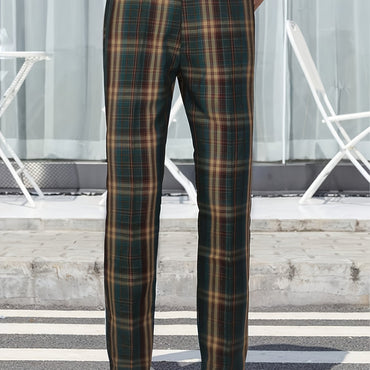 Men'S Slim Fit Plaid Trousers - Versatile Regular Fit Business and Casual Pants, Woven Polyester Fabric, Button Detail, Ideal for Work and Formal Occasions, Business Suit Pants|Classic Tartan Pattern|Woven Fabric Pants