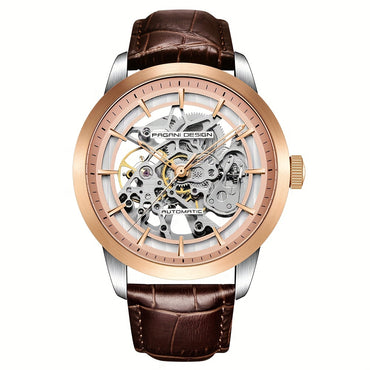 Automatic Mechanical Watch For Men By PAGANI DESIGN With Stainless Steel Case, Hollow Dial, Leather Strap, Butterfly Clasp, And Water Resistance