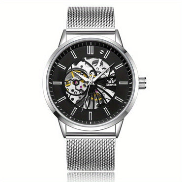 SEWOR Men's Mechanical Watch - Automatic winding, Waterproof, Black Dial with Golden Hands & Transparent rotor, Mesh steel belt - Formal & Everyday Watch for Men - Mechanical Movement No Battery Needed - Ideal Gift for Watch Enthusiasts, Automatic Mechani