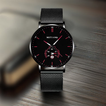 [Men's Mesh Strap Quartz Watch] 1pcs Men's Black and Red Mesh Strap Quartz Watch - Novel Car Disk, Night Light Calendar, Personalized Style