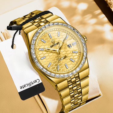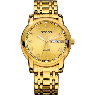 ROCOS Brand Simple Business Men'S Watch Retro Roman Scale Quartz Watch Steel Strap Men'S Watch Golden Case Calendar Week Display Gift For Men
