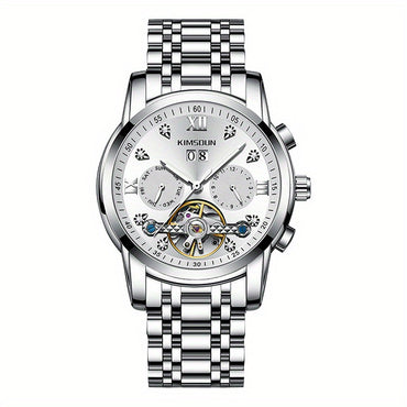 1pc Men's Silvery White Steel Band Fashion Style Handsome Automatic Tourbillon Calendar Multifunctional Mechanical Watch