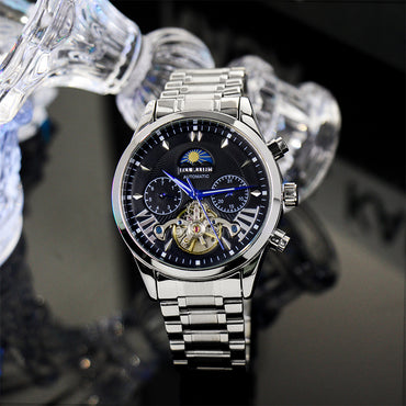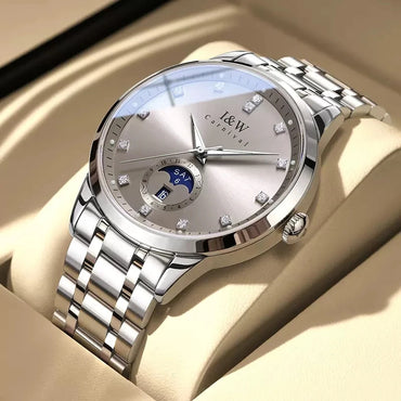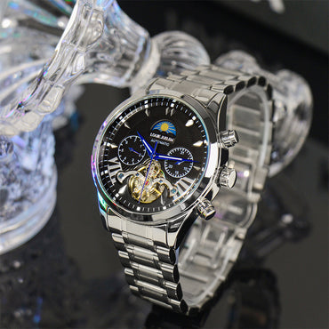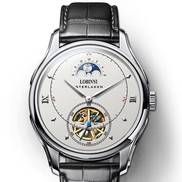 LOBINNI Men's Interlaken Automatic Watch - Elegant Stainless Steel Band, Moon Phase & Hollow Skeleton Design, Water-Resistant up to 5BAR, with Faux Leather Strap