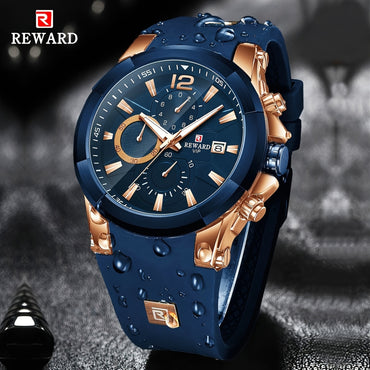 REWARD Men's Luxury Chronograph Sport Watch - Blue & Golden Accents, Quartz Movement with Date/Stopwatch/Second Timer, Casual Elegant Design for Casual Attire, Bling Watch, Versatile Wristwatch, Bold Accent Details, Durable Finish
