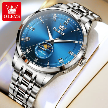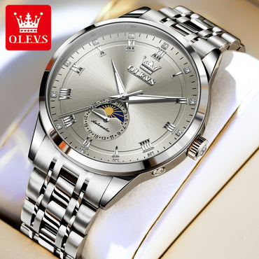 OLEVS Brand Moon Phase Stainless Steel Automatic Mechanical Watches for Men Best Selling Original Fashion Trend Luxury Business Men's Wrist Watches, Mechanical Watches for Men High Quality, Formal Timepiece, Office Accessory, Sophisticated Dial, Modern Cl