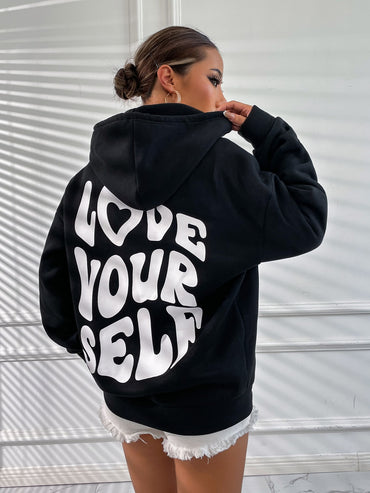 MOOSTA Slogan Graphic Drop Shoulder Drawstring Thermal Lined Hoodie LOVE YOURSELF,Long Sleeve Tops