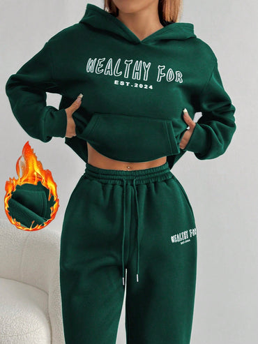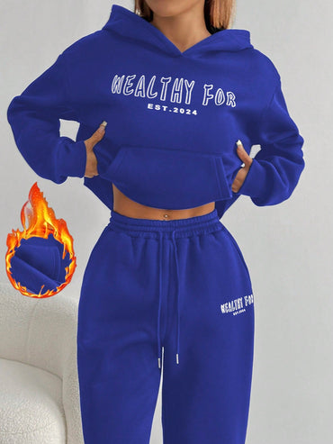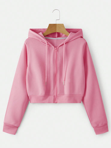EZwear Women Casual Solid Color Drop Shoulder Loose Zip-Up Cropped Hoodie & Sweatpants Set