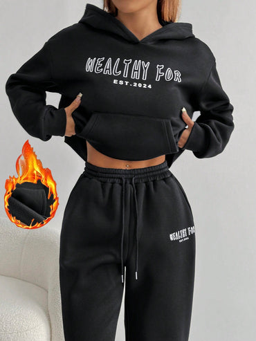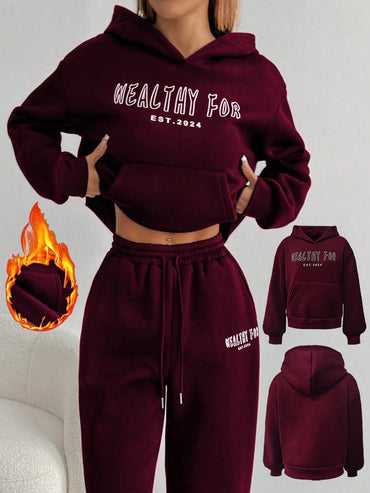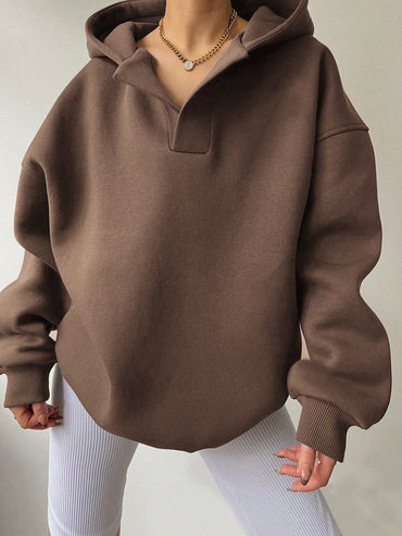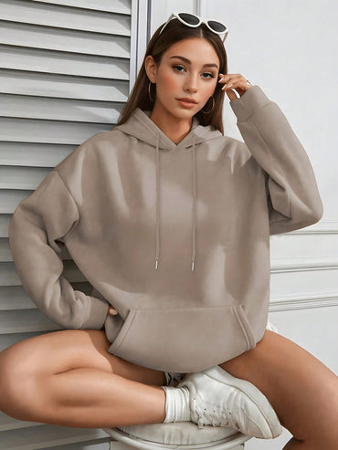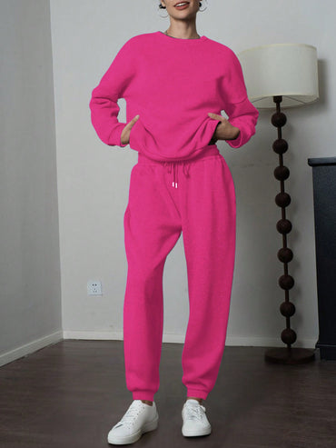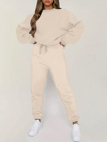 INAWLY 2pcs/Set Women Casual Solid Color Dropped Shoulder Loose Fleece Sweatshirt And Drawstring Waist Jogger Pants, Autumn/Winter