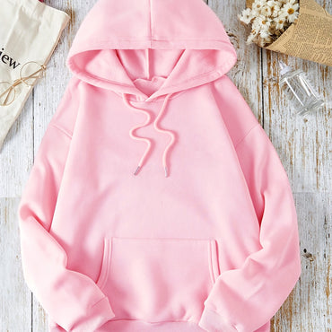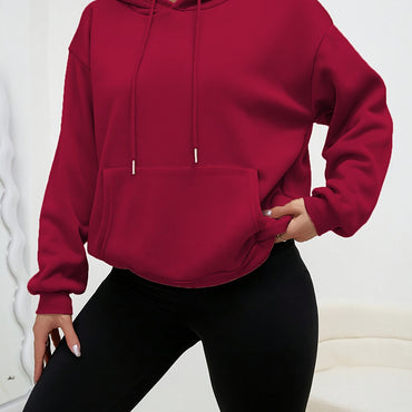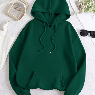 New Trendy Women'S Autumn And Winter Solid Color Drawstring Hooded Sweatshirt, Thickened with Kangaroo Pockets, Long Sleeve Casual Sports Top.