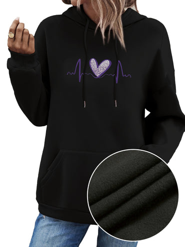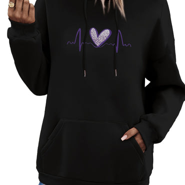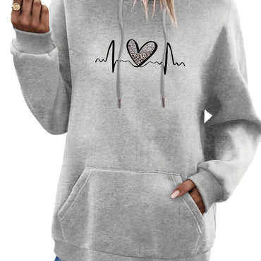Leopard Heart Print Loose Hoodie, Casual Drawstring Kangaroo Pocket Hoodies Sweatshirt, Women's Clothing