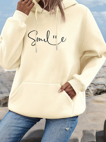 SMILE Print Kangaroo Pocket Hoodie, Casual Long Sleeve Drawstring Hoodie Sweatshirt, Women's Clothing