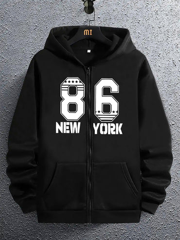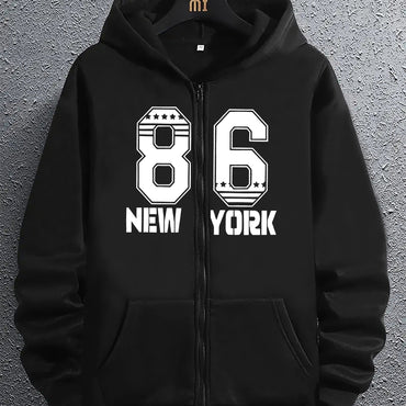 [New York 86 Print Hoodie] Unisex New York 86 Print Zip-Up Hoodie - Casual Long Sleeve Hooded Sweatshirt with Kangaroo Pocket, All-Season Knit Polyester Fabric - Fashionable Pullover