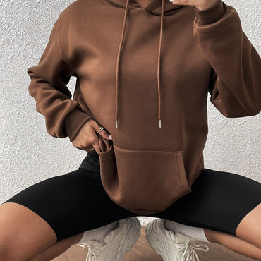 [Everyday Style] Women's Casual Brown Fleece-Lined Hoodie - Versatile Long Sleeve, Drawstring, Polyester Sportswear with Front Pocket for Fall/Winter, Sweater Hoodie