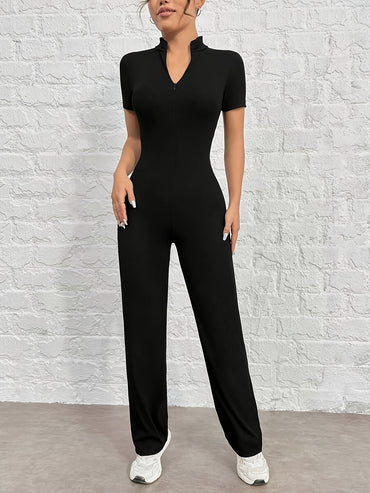 Rachel Directional Women's Black Casual Knit Bodysuit - Short Sleeve, Zip-Up with Collar, Stretchy Polyester Blend, Machine Washable, Perfect for Beach & Casual Attire, Everyday Comfort Wear|Sleek Knit Design|Smooth Fabric Finish