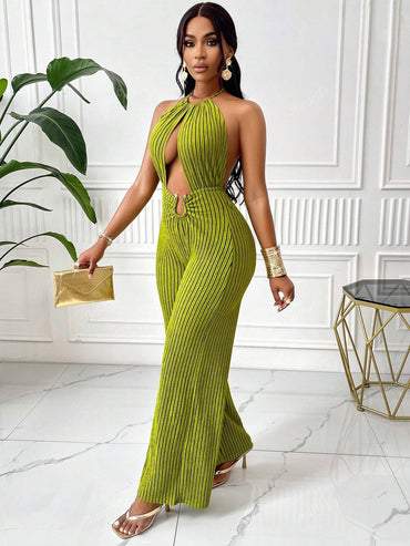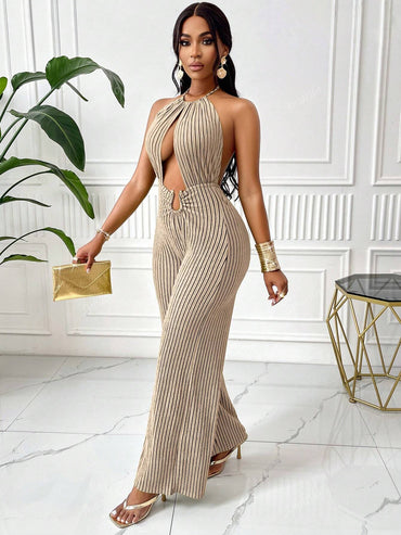 Women'S Stripe Texture Elegant Halter Neck With Hollow Out Metal Decorated Buckle Jumpsuit