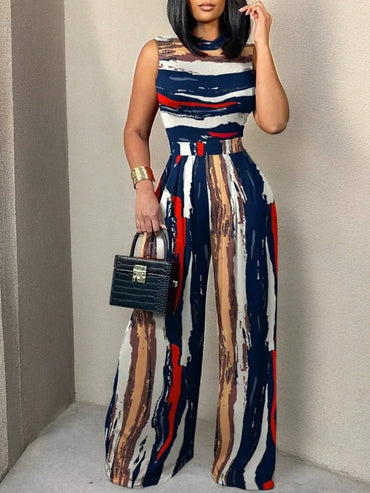 Women Sexy Elegant Color Contrast Printed Stripes Elegant Sleeveless Women's Jumpsuit