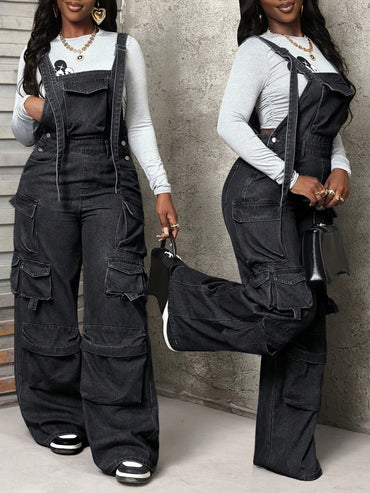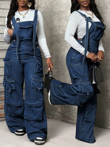 Slayr Solid Color Thick Strap Pocket Casual Loose Fit Denim Jumpsuit