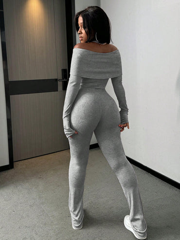 Women's Solid Color Off Shoulder Long Sleeve Casual Jumpsuit, Spring & Autumn