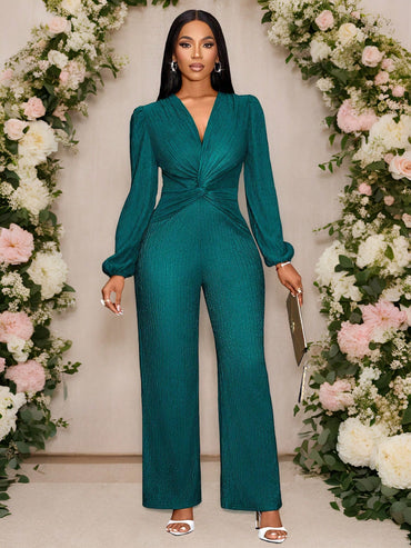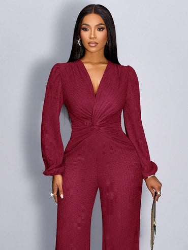 SOLERSUN Twist Knotted Deep V-Neck Long Sleeve Jumpsuit