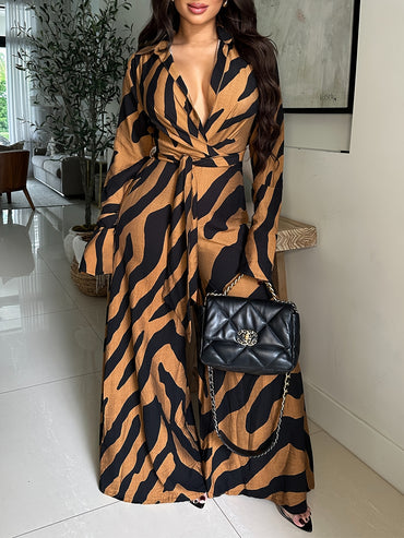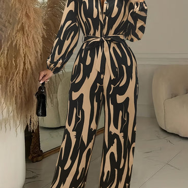 Women'S Elegant Polyester Jumpsuit with Self-Tying Waist and Front Button, Long Sleeve Lantern Sleeves, All Over Print, Regular Fit, Straight Leg, Woven Fabric, 100g/m² - Perfect for Spring/Summer/Fall Weekend Casual Wear