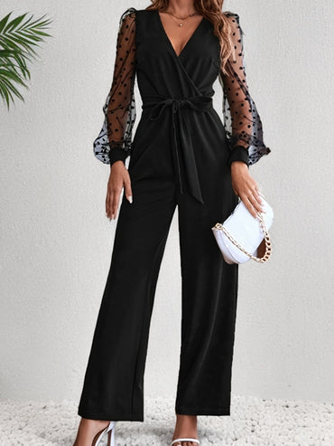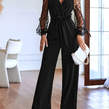 Elegant Lace-Trim V-Neck Jumpsuit with Lantern Sleeves - Long, Loose Fit for Women, Machine Washable