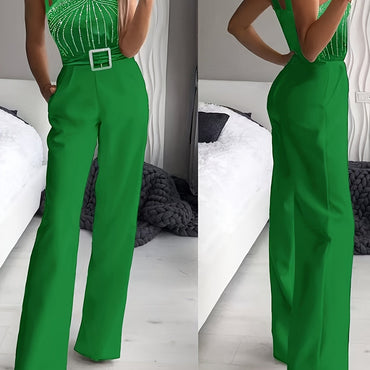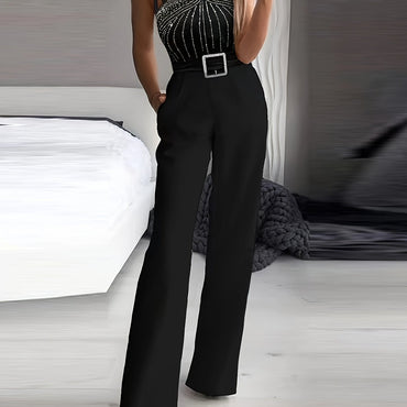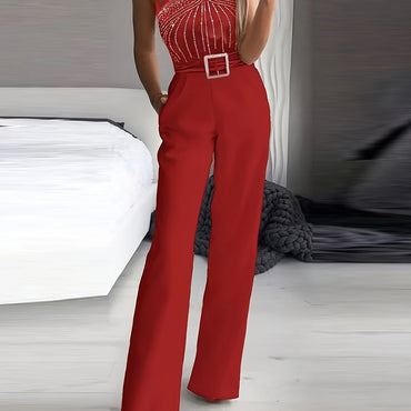 [Red Rhinestone Jumpsuit] Sleeveless Red Rhinestone Wide-Leg Jumpsuit - V-Neck with Belt Detail, Machine Washable, Casual to Semi-Formal
