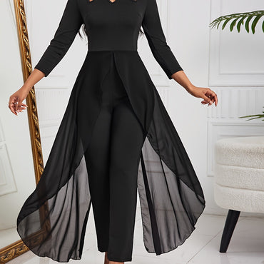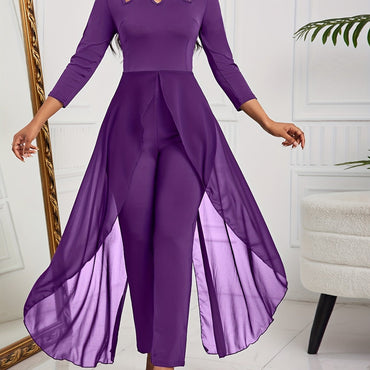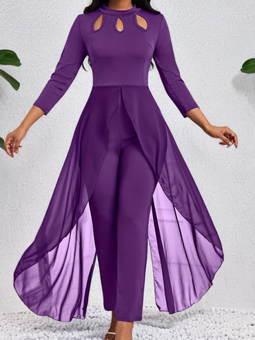Long Sleeve Solid Crew Neck Cut Out Jumpsuit - Elegant High Elasticity Polyester Unitard with Hollow Details - Machine Washable, Perfect for Spring, Summer, and Fall Seasons