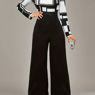Elegant Women's Black & White Checkered Print Long Sleeve Round Neck Wide-Leg Jumpsuit - Chic Stretch Comfort Fit for Parties, Commuting & Everyday Elegance, Machine Washable