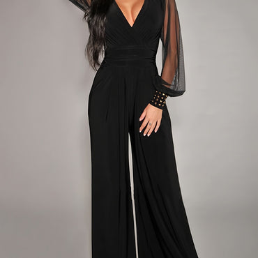 Wide Leg Plunging Neck Sleeveless Jumpsuit, Elegant For Spring & Summer, Women's Clothing