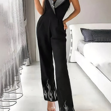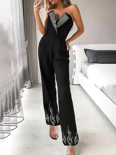 Women'S Sexy Off-Shoulder Fire Pattern Rhinestone Long Jumpsuit, 100% Polyester Slim Fit Sleeveless Party Romper, Woven Fabric 180g/m², All Season Festive Adult Jumpsuit